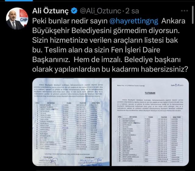 Göngör’e CHP’den cevap CHP Genel Lider Yardımcısı ve Kahramanmaraş Milletvekili Ali Öztunç’tan geldi. Öztunç, iki adet doküman paylaşarak, “Peki bunlar nedir Sayın Hayrettin Güngör. Ankara Büyükşehir Belediyesini görmedim diyorsun. Sizin hizmetinize verilen araçların listesi bak bu. Teslim alan da sizin Fen İşleri Daire Lideriniz.Hem de imzalı. Belediye lideri olarak yapılanlardan bu kadarmı habersizsiniz?” tabirlerini kullandı.