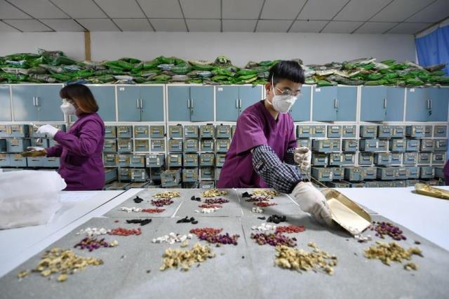Çin’in kuzeyindeki Hebei eyaletinde bulunan Tangshan’ın Fengnan bölgesindeki Klasik Çin Tıbbı Hastanesi’nde ilaç hazırlayan eczacılar, 15 Ocak 2023. (Fotoğraf: Mu Yu/Xinhua)